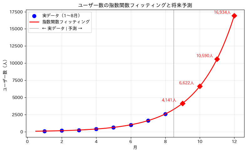 最適パラメータ:a = 60.55, b = 0.4695 フィッティング式:y = 60.55 × exp(0.4695 × x) 9月の予測ユーザー数:4,141 人 10月の予測ユーザー数:6,622 人 11月の予測ユーザー数:10,590 人 12月の予測ユーザー数:16,934 人
