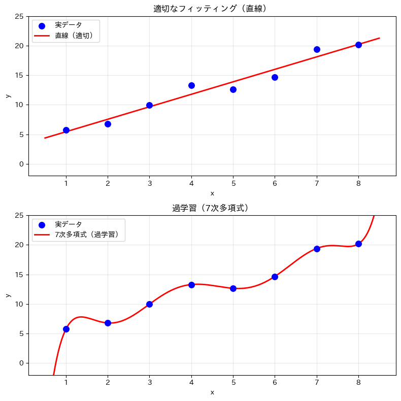 一方、下のグラフは7次多項式でデータ点に過剰にフィットしており、データ点の間で大きく波打っています。新しいデータには合わない可能性が高く、これが過学習です。