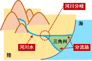 デルタ(三角州)は、河口近くで河川流が分流し、この枝分かれした分流路と海岸がなす形が、ギリシア文字のデルタ(Δ)に似ています。
