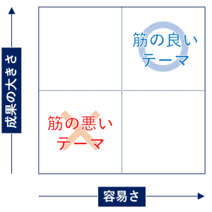 - 筋が良いとは、上手くいけばビジネス成果が大きく、しかも、分析も活用も容易なテーマです