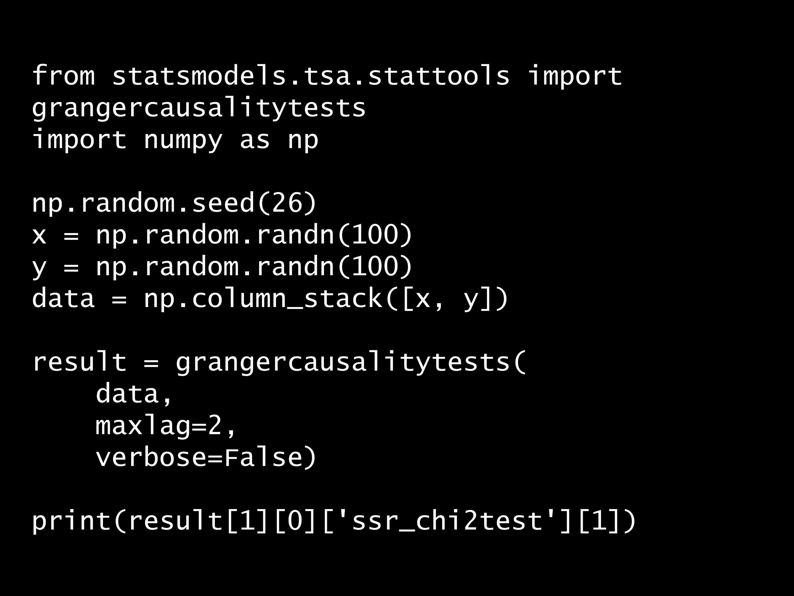 たとえば、result[1][0]['ssr_chi2test'][1]により、ラグ1におけるχ二乗検定のp値にアクセスできます(`[1]`がp値を指しています。検定統計量にアクセスする場合は`[0]`を使用します)。