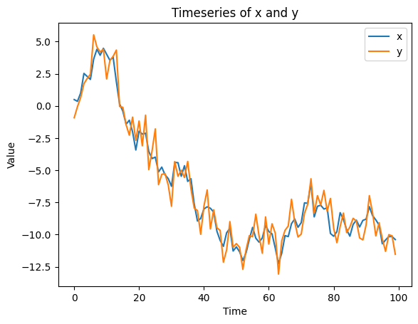 yは、最初の時系列xにランダムノイズ(ここでは0平均、標準偏差1の正規分布からのランダムな値)を追加することで生成されます。このノイズ項があることで、xとyの間にある程度のばらつきが生じます。y = x + np.random.randn(100)