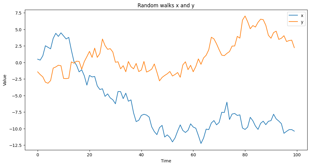 plt.figure(figsize=(12, 6)) plt.plot(x, label='x') plt.plot(y, label='y') plt.title('Random walks x and y') plt.xlabel('Time') plt.ylabel('Value') plt.legend() plt.show()以下、実行結果です。