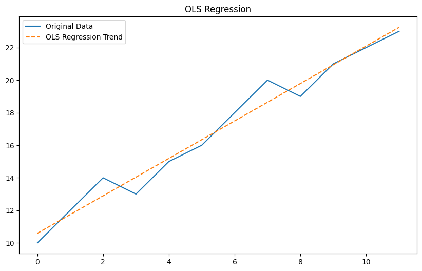 # 最小二乗法回帰 (Ordinary Least Squares Regression) X = sm.add_constant(index) model = sm.OLS(data, X).fit() trend = model.predict(X) plt.figure(figsize=(10, 6)) plt.plot(data, label='Original Data') plt.plot(trend, label='OLS Regression Trend', linestyle='--') plt.legend() plt.title('OLS Regression') plt.show()以下、実行結果です。