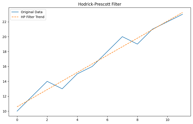 # Hodrick-Prescottフィルター (Hodrick-Prescott Filter) cycle, trend_hp = sm.tsa.filters.hpfilter(data, lamb=1600) plt.figure(figsize=(10, 6)) plt.plot(data, label='Original Data') plt.plot(trend_hp, label='HP Filter Trend', linestyle='--') plt.legend() plt.title('Hodrick-Prescott Filter') plt.show()以下、実行結果です。
