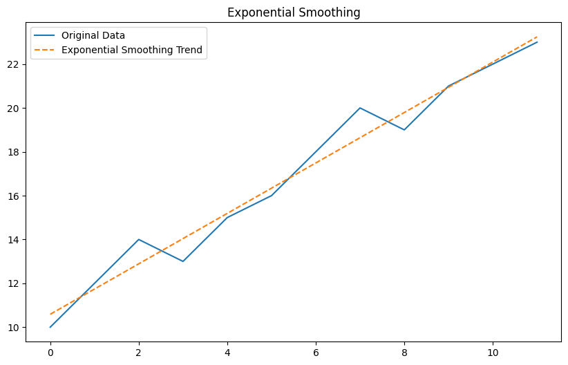 # 指数平滑法 (Exponential Smoothing) from statsmodels.tsa.holtwinters import ExponentialSmoothing model_es = ExponentialSmoothing(data, trend='add').fit() trend_es = model_es.fittedvalues plt.figure(figsize=(10, 6)) plt.plot(data, label='Original Data') plt.plot(trend_es, label='Exponential Smoothing Trend', linestyle='--') plt.legend() plt.title('Exponential Smoothing') plt.show()以下、実行結果です。