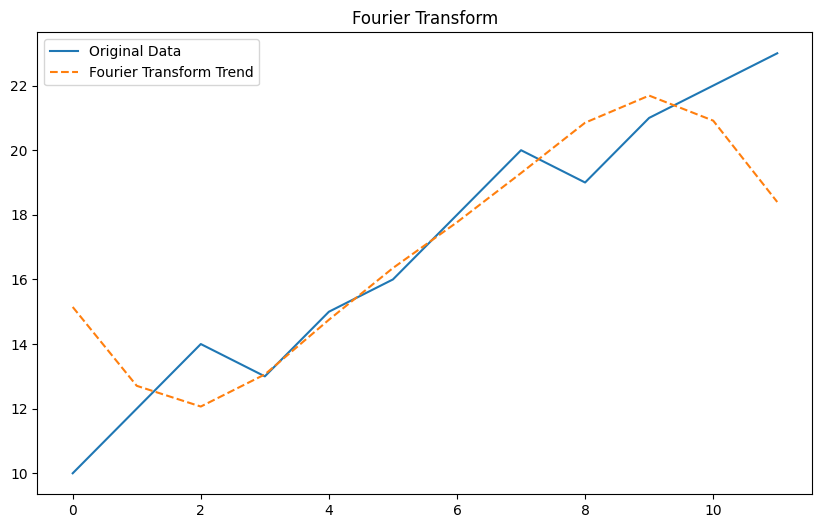 # Fourier変換 (Fourier Transform) from scipy.fft import fft, ifft # Fourier変換 data_fft = fft(data) # 高周波成分を除去 n = len(data) cutoff = 2 # 低周波成分の数 data_fft[cutoff:-cutoff] = 0 # 逆Fourier変換 trend_fft = ifft(data_fft).real plt.figure(figsize=(10, 6)) plt.plot(data, label='Original Data') plt.plot(trend_fft, label='Fourier Transform Trend', linestyle='--') plt.legend() plt.title('Fourier Transform') plt.show()以下、実行結果です。