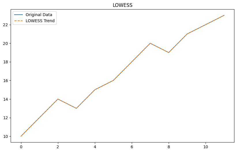 # ローカル回帰 (LOESS/LOWESS) from statsmodels.nonparametric.smoothers_lowess import lowess # LOWESSの適用 trend_lowess = lowess(data, index, frac=0.3)[:, 1] plt.figure(figsize=(10, 6)) plt.plot(data, label='Original Data') plt.plot(trend_lowess, label='LOWESS Trend', linestyle='--') plt.legend() plt.title('LOWESS') plt.show()以下、実行結果です。