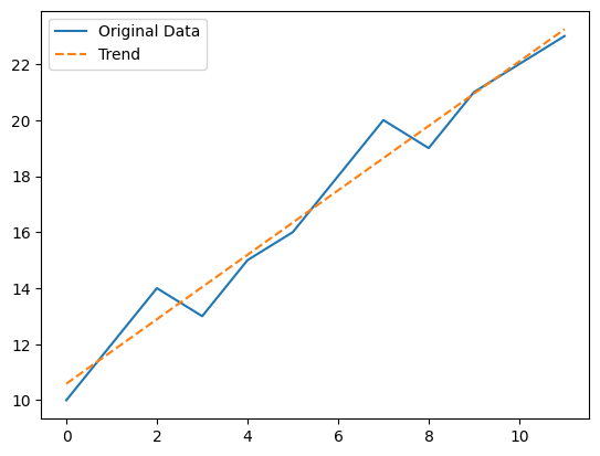 plt.plot(data, label='Original Data') plt.plot(trend, label='Trend', linestyle='--') plt.legend() plt.show()