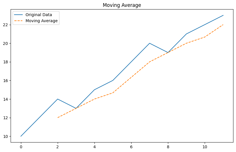 # 移動平均法 (Moving Average) import matplotlib.pyplot as plt data = pd.Series([10, 12, 14, 13, 15, 16, 18, 20, 19, 21, 22, 23]) window_size = 3 moving_average = data.rolling(window=window_size).mean() plt.figure(figsize=(10, 6)) plt.plot(data, label='Original Data') plt.plot(moving_average, label='Moving Average', linestyle='--') plt.legend() plt.title('Moving Average') plt.show()以下、実行結果です。