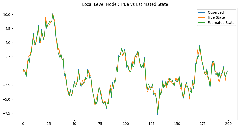 import numpy as np import pandas as pd import statsmodels.api as sm import matplotlib.pyplot as plt # データの生成 np.random.seed(12345) nobs = 200 true_state = np.cumsum(np.random.normal(size=nobs)) observed = true_state + np.random.normal(scale=0.5, size=nobs) # モデルの定義と推定 mod = sm.tsa.UnobservedComponents(observed, 'local level') res = mod.fit() # 結果の表示 print(res.summary()) # フィルタリングされた状態の取得 state_estimates = res.filtered_state[0] # プロット plt.figure(figsize=(12,6)) plt.plot(observed, label='Observed') plt.plot(true_state, label='True State') plt.plot(state_estimates, label='Estimated State') plt.legend() plt.title('Local Level Model: True vs Estimated State') plt.show()このコードは、ローカルレベルモデルを使用して、観測データから真の状態を推定します。プロットを見ることで、モデルが観測データからノイズを除去し、真の状態をどの程度正確に推定できているかを視覚的に確認することができます。