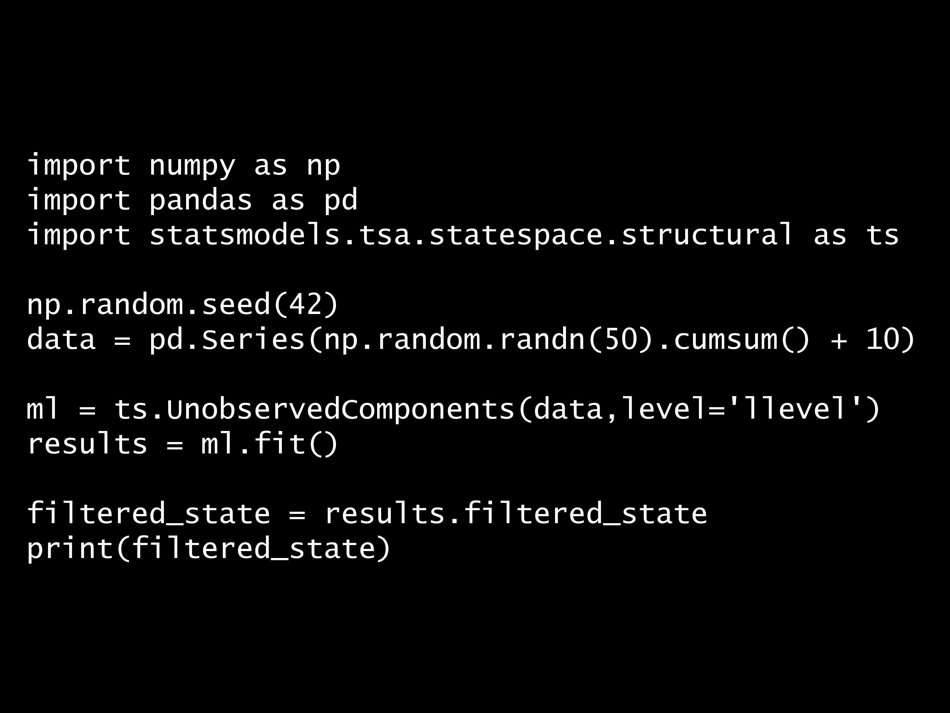import numpy as np import pandas as pd import statsmodels.tsa.statespace.structural as ts np.random.seed(42) data = pd.Series(np.random.randn(50).cumsum() + 10) ml = ts.UnobservedComponents(data,level='llevel') results = ml.fit() filtered_state = results.filtered_state print(filtered_state)