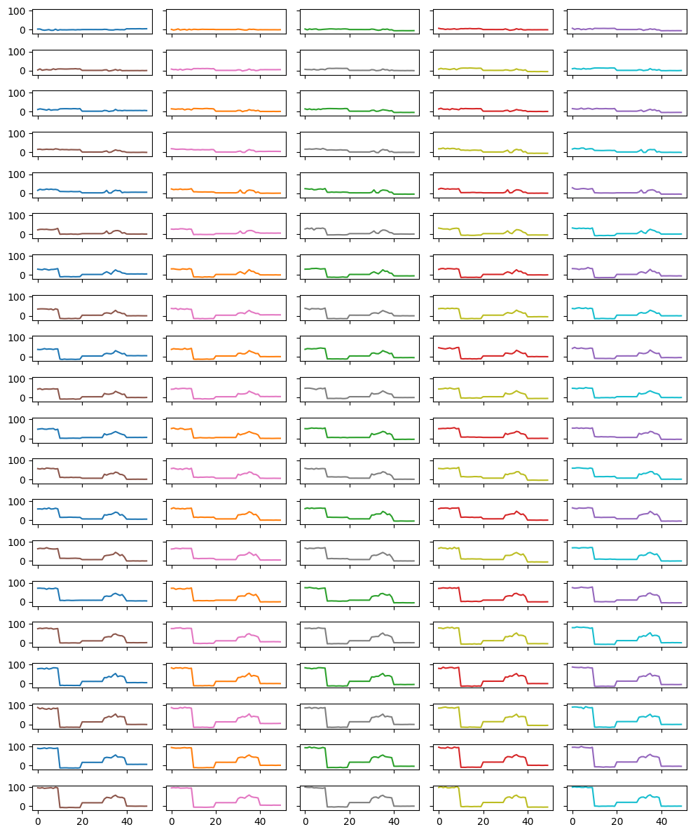 dfには、以下のようなデータが格納されています。Time_0 Time_1 Time_2 Time_3 Time_4 Time_5 Time_6 \ 0 3.528105 1.800314 3.957476 7.481786 7.735116 3.045444 7.900177 1 3.766301 -1.695518 -0.540970 4.938793 1.653753 8.887242 5.172762 2 -0.738364 0.521242 4.199319 4.310527 5.280263 1.766088 5.951348 3 -2.613054 4.316261 1.763672 1.639644 5.332766 4.078560 3.331483 4 -1.197308 -1.231794 3.533326 3.712586 0.462923 5.710964 7.629040 Time_7 Time_8 Time_9 ... Time_90 Time_91 Time_92 \ 0 6.697286 7.793562 9.821197 ... 89.193646 93.444890 92.416550 1 5.505090 11.845884 11.961030 ... 87.414286 91.534102 91.921434 2 5.523938 8.559849 8.803699 ... 88.743825 90.037946 96.607833 3 4.306565 9.387546 8.680853 ... 91.134581 90.554650 91.293137 4 7.117851 7.629893 7.384703 ... 87.940129 90.300113 94.200569 Time_93 Time_94 Time_95 Time_96 Time_97 Time_98 \ 0 94.953278 94.712733 96.413146 96.021000 100.571741 98.253824 1 90.663813 95.046553 94.656907 97.543581 98.647008 102.326472 2 90.879968 93.728101 97.273783 96.195450 98.165907 97.201102 3 89.767052 93.416325 93.477016 97.715848 99.282204 100.933157 4 95.596044 99.392448 94.852151 94.682894 95.971532 95.963916 Time_99 0 99.803979 1 101.673056 2 99.740112 3 100.705104 4 98.844290 [5 rows x 100 columns]dfには複数の時系列データが格納されています。プロットすると以下のようになります。