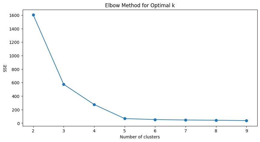 import matplotlib.pyplot as plt from sklearn.metrics import silhouette_score from tslearn.clustering import TimeSeriesKMeans # エルボー法のためのSSE計算 sse = [] for k in range(2, 10): model = TimeSeriesKMeans( n_clusters=k, metric="dtw", random_state=0) model.fit(time_series_df) sse.append(model.inertia_) # エルボー法のプロット plt.figure(figsize=(10, 5)) plt.plot(range(2, 10), sse, marker='o') plt.title('Elbow Method for Optimal k') plt.xlabel('Number of clusters') plt.ylabel('SSE') plt.show()以下、実行結果です。