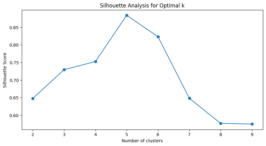 silhouette_scores = [] for k in range(2, 10): model = TimeSeriesKMeans( n_clusters=k, metric="dtw", random_state=0) labels = model.fit_predict(time_series_df) silhouette_avg = silhouette_score( time_series_df, labels, metric="euclidean") silhouette_scores.append(silhouette_avg) # シルエット分析のプロット plt.figure(figsize=(10, 5)) plt.plot(range(2, 10), silhouette_scores, marker='o') plt.title('Silhouette Analysis for Optimal k') plt.xlabel('Number of clusters') plt.ylabel('Silhouette Score') plt.show()以下、実行結果です。