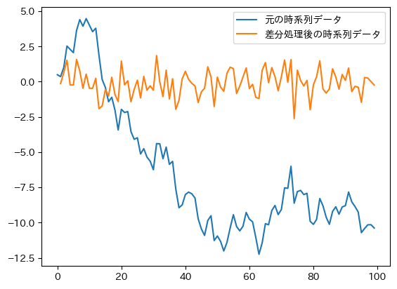 import numpy as np import pandas as pd import matplotlib.pyplot as plt import japanize_matplotlib # 元の時系列データを生成 np.random.seed(42) data = pd.Series(np.random.randn(100).cumsum()) # 元の時系列データに対し差分処理を実施 diff_data = data.diff().dropna() plt.plot(data, label='元の時系列データ') plt.plot(diff_data, label='差分処理後の時系列データ') plt.legend() plt.show()