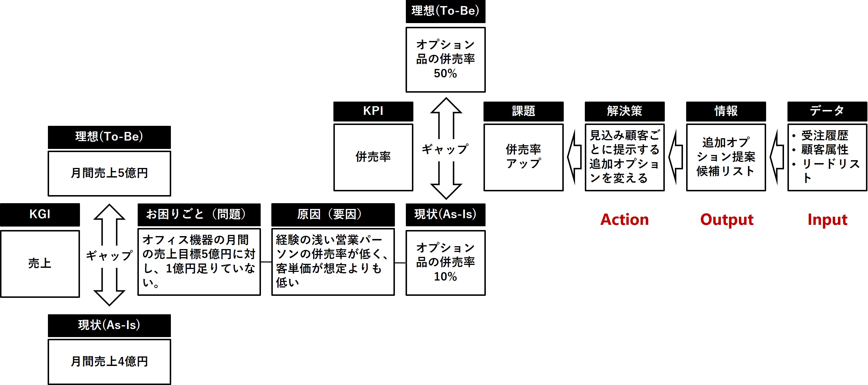 ●テーマ設計③(データ活用ストーリーのデザイン) | ●傾向分析事例 ・モニタリング指標(売上や案件数、CV数、PV数など)の異常検知 ・モニタリング指標に問題が起こったときにその要因を探る要因分析 ●近未来分析事例 ・売上などのモニタリング指標を予測する時系列解析モデル構築(売上予測など) など |