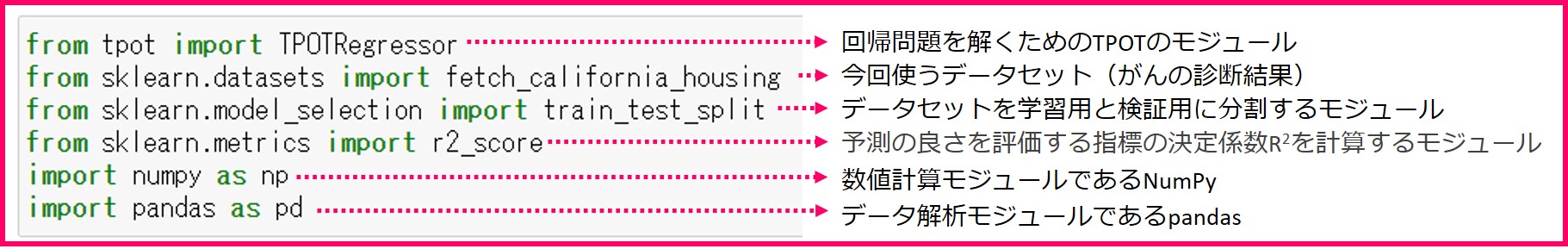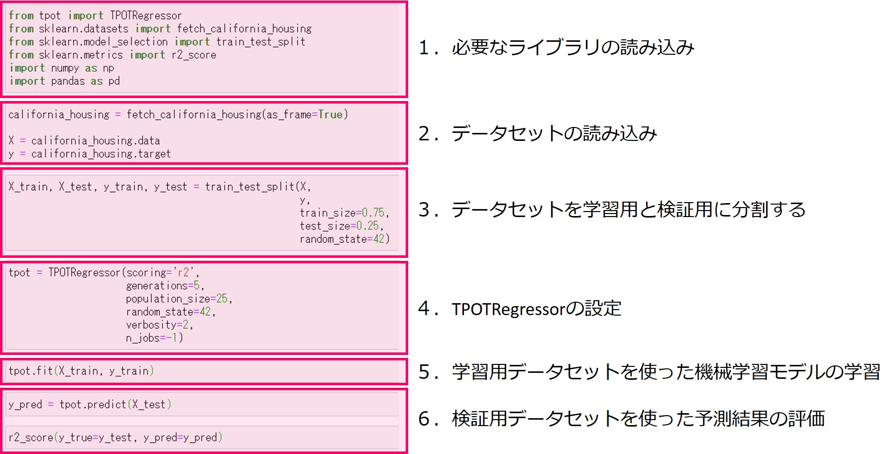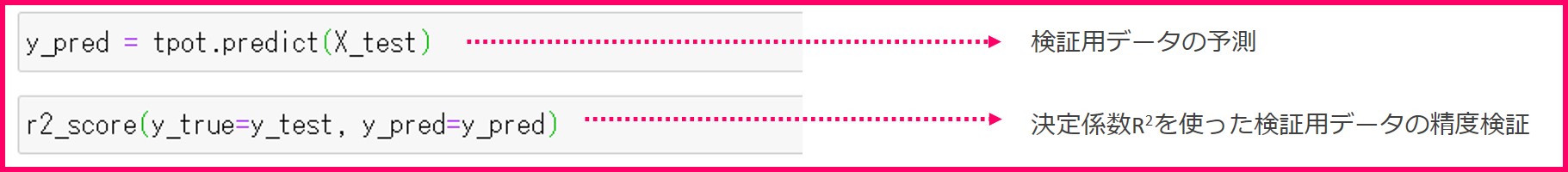 分類問題との大きな違いは、「TPOTClassifier」(分類)ではなく「TPOTRegressor」(回帰)を使うところです。