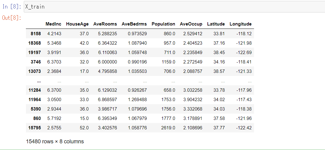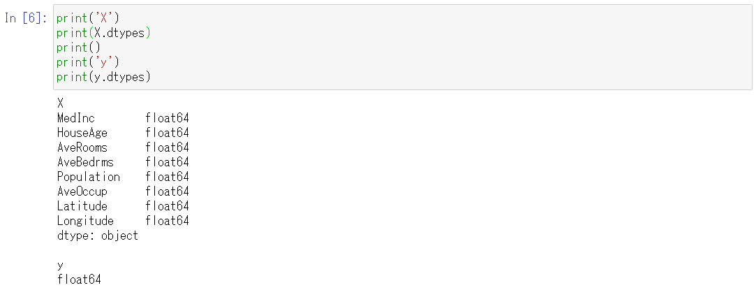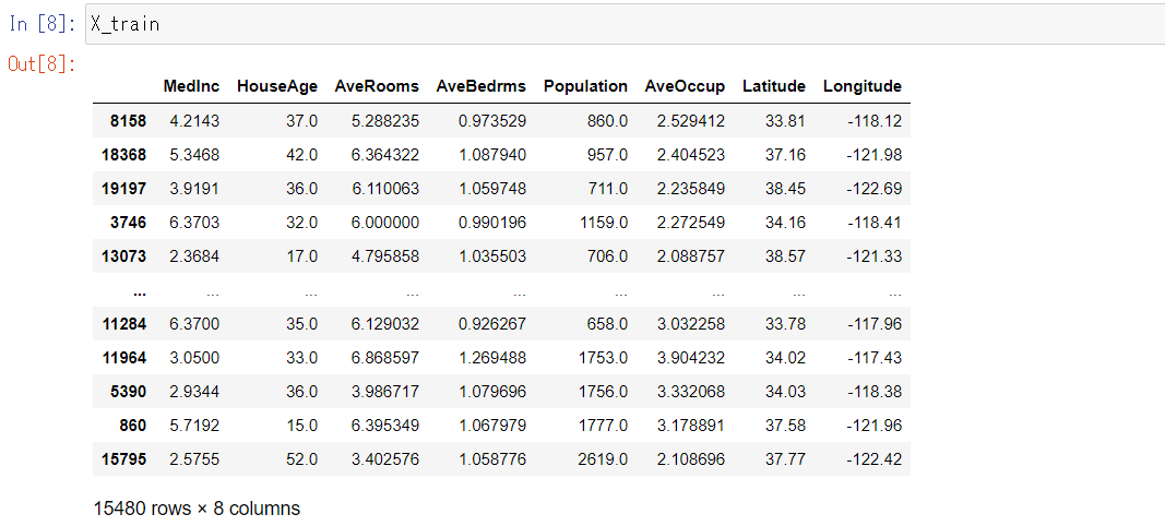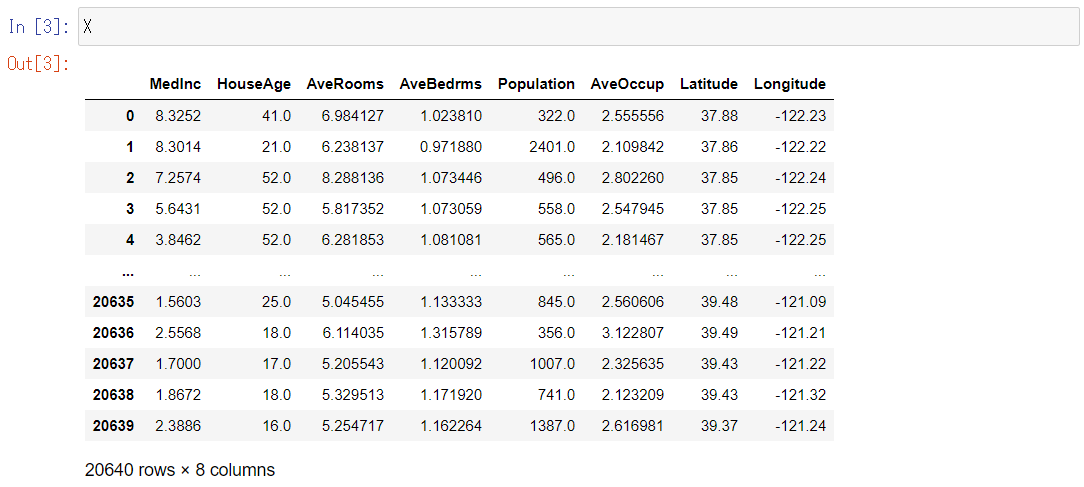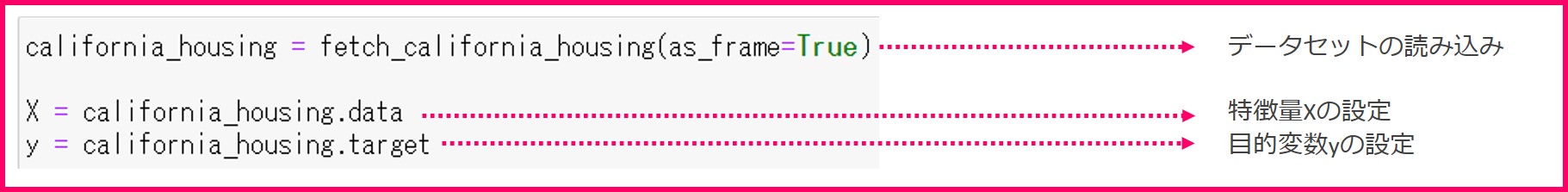 • 特徴量(説明変数)であるfetch_california_housing.dataをXに格納