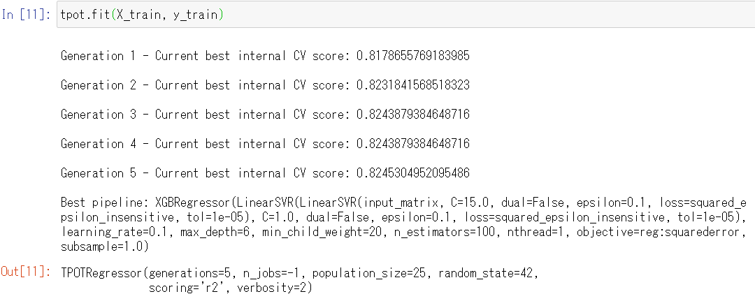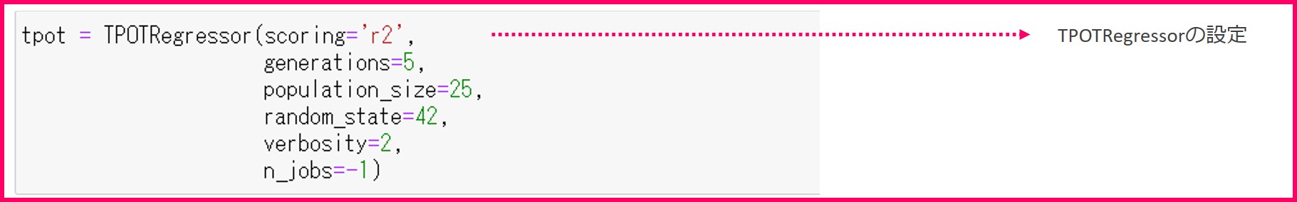 • scoringパラメータでは、回帰問題のどの評価指標を用いてモデルを最適化するかを指定することができます。ここの例ではr2スコア(決定係数R2)を使います。指定できる評価指標は多数ありますので、TPOTのリファレンスページの(http://epistasislab.github.io/tpot/api/Parameters>scoringの説明文をご覧ください。