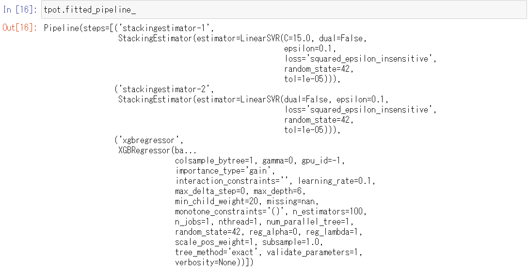 今回の例ですと、2種類の「線形サポートベクターマシン回帰」(LinearSVR)と「XGBoost回帰」(XGBRegression)をスタッキング(stacking)した数理モデルを構築するのが、検討した結果最良であるということになります。