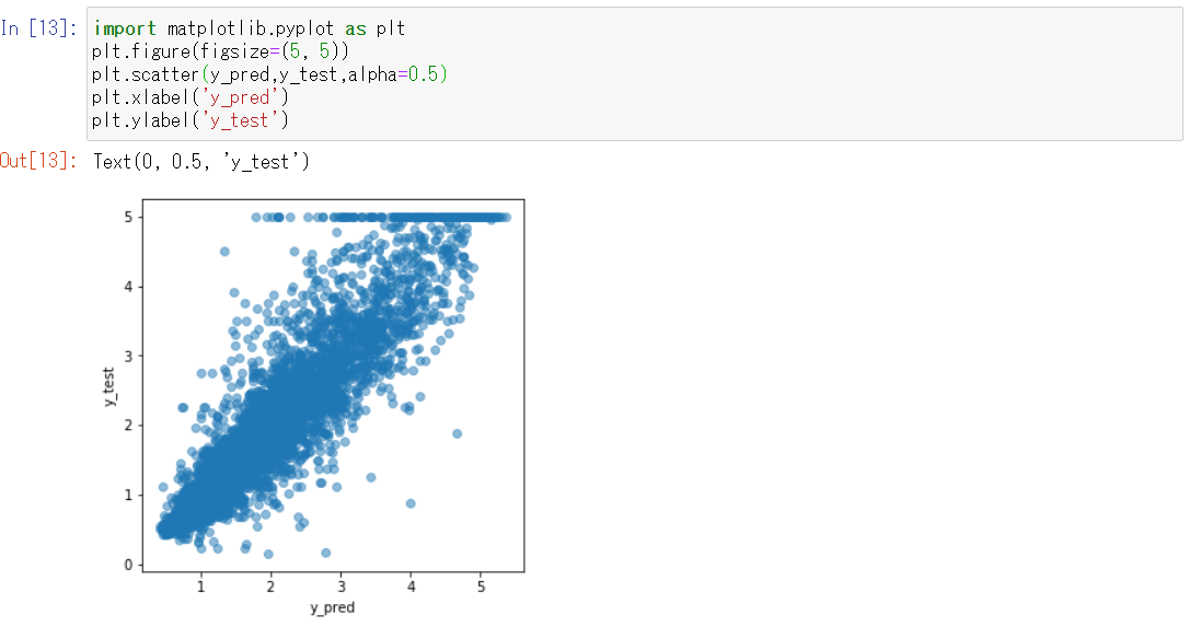 ただ、y_pred=y_testの線のやや左側にプロットが寄っていることと、y_test=5のプロットがうまく予測できていないので、まだ改善の余地はありそうです。