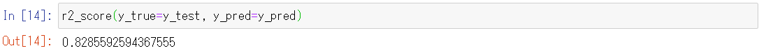 検証用データセットをできたモデルで予測してみて、回帰モデルの評価指標の一つである決定係数R2を計算します。