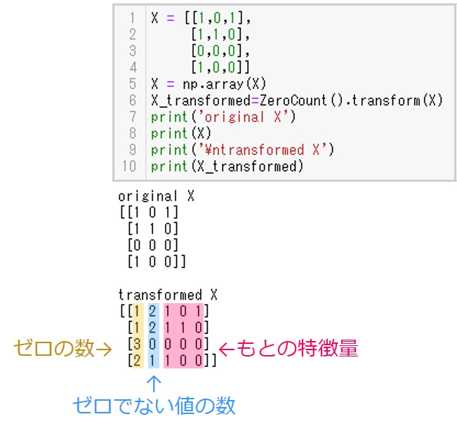| tpot.builtins.ZeroCount | 行ごとにゼロの数を数え、値がゼロである数とゼロでない数を特徴量として付け加えます。