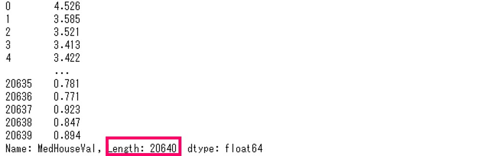 目的変数yには20,640行のデータが読み込まれていることがわかります。
