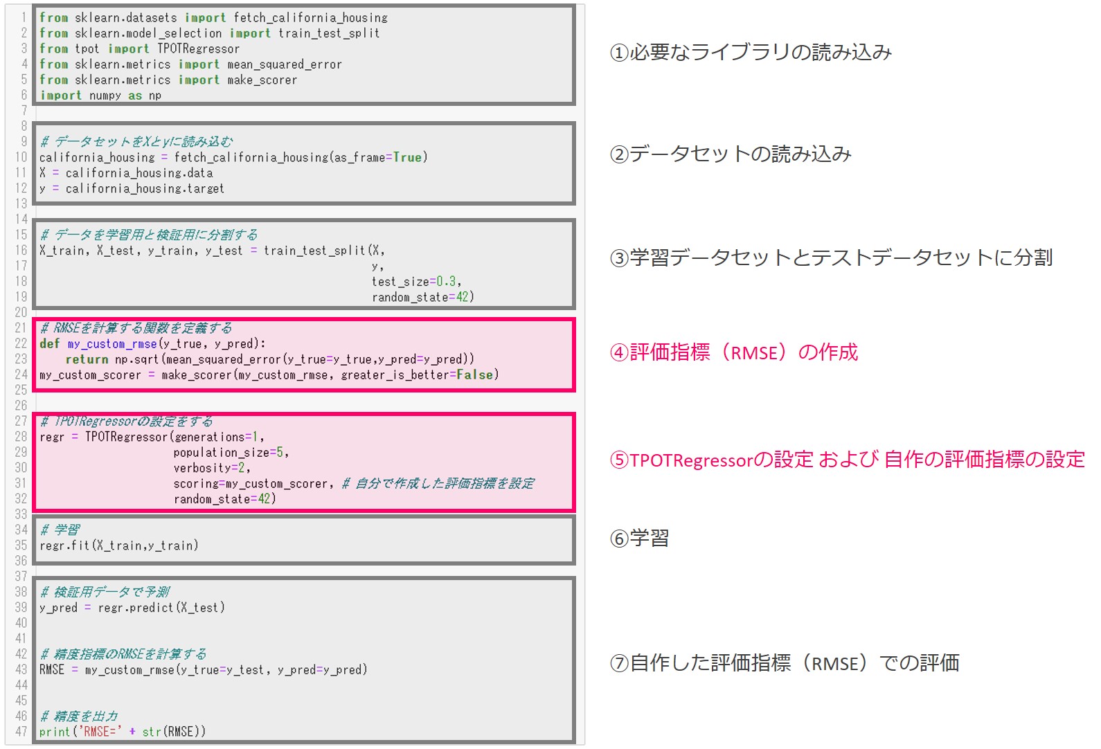 以下は、ソースコードの全体像です。すでに説明した内容も入っていますので、自作の評価指標の使い方だけ知りたい方は、④と⑤の説明だけ読んでも結構です。