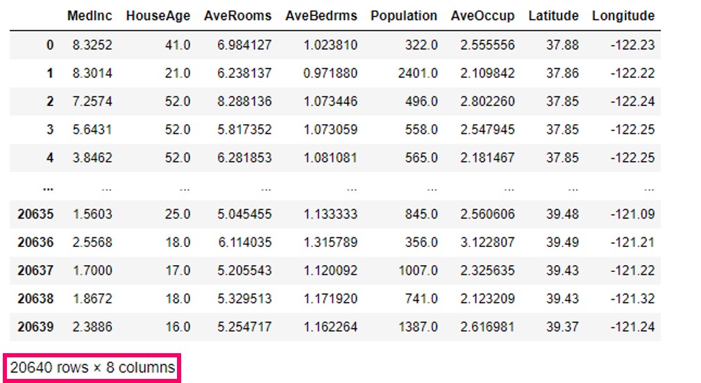 特徴量Xには20,640行×8列のデータが読み込まれていることがわかります。