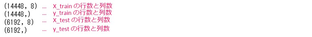 print(np.shape(X_train)) # X_trainの行数と列数を確認 print(np.shape(y_train)) # y_trainの行数と列数を確認 print(np.shape(X_test)) # X_testの行数と列数を確認 print(np.shape(y_test)) # y_testの行数と列数を確認