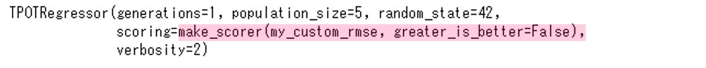 次に、my_scorer関数を使ってTPOTへ自作のRMSEを渡します。