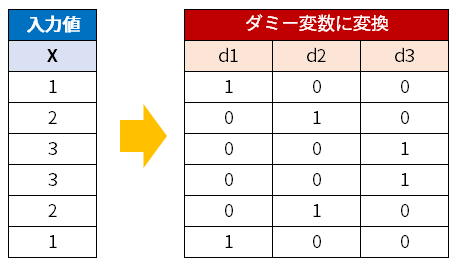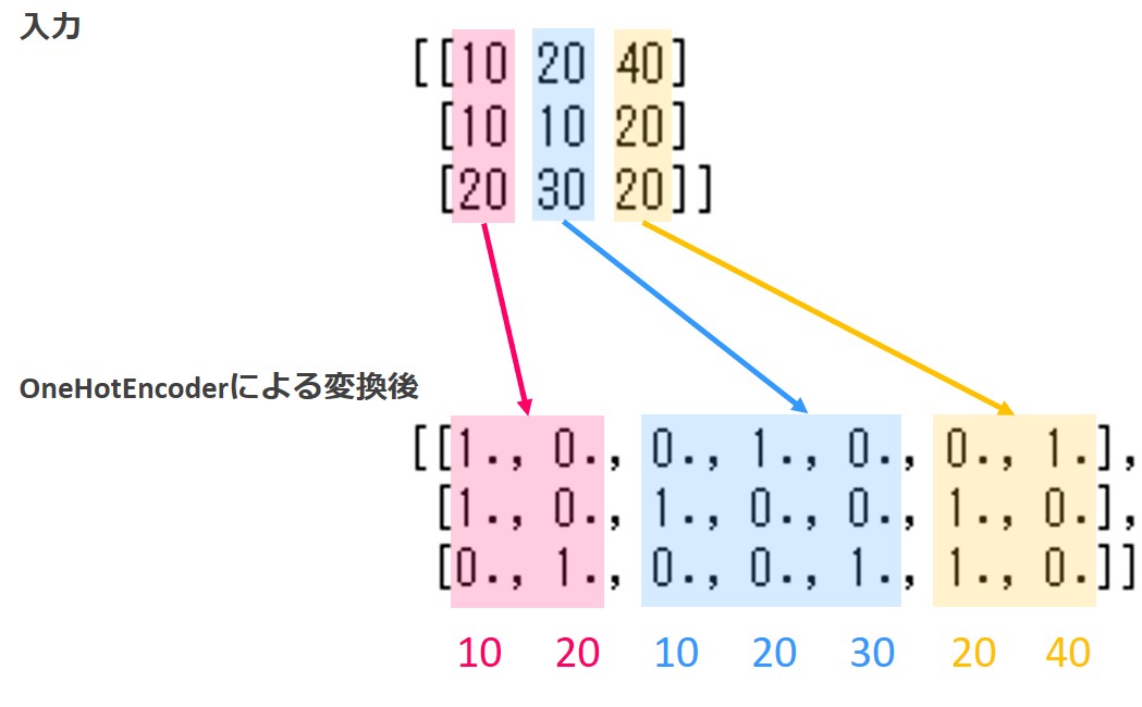 OneHotEncoderは、入力値をダミー変数に変換した配列を返す関数です。