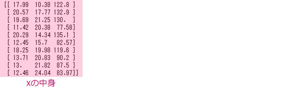 ## データの読み込み data = load_breast_cancer() X = data.data # 特徴量をXに格納 y = data.target # 目的変数をyに格納