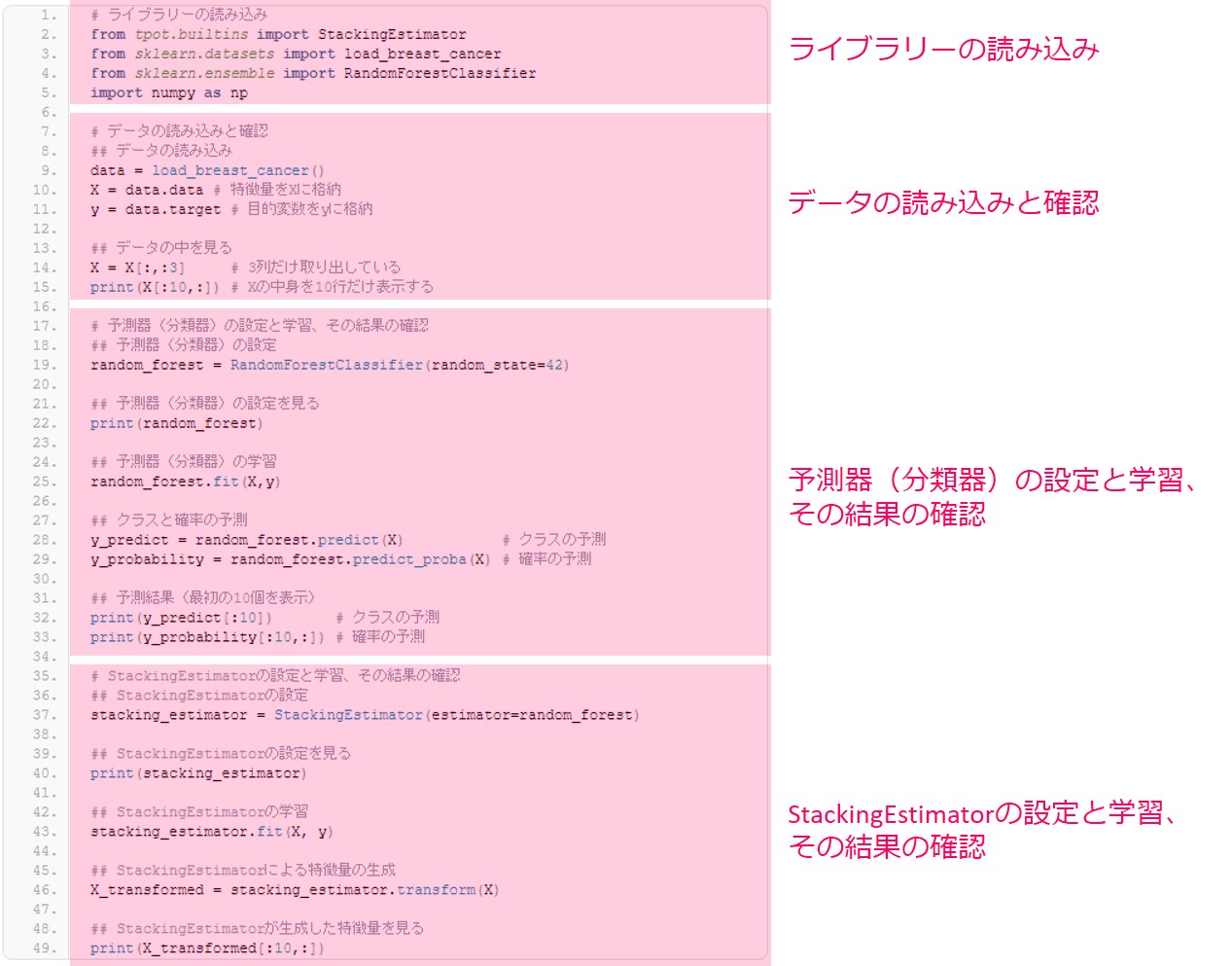 # ライブラリーの読み込み from tpot.builtins import StackingEstimator from sklearn.datasets import load_breast_cancer from sklearn.ensemble import RandomForestClassifier import numpy as np