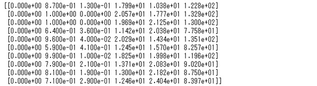 ## データの中を見る X = X[:,:3] # 3列だけ取り出している print(X[:10,:]) # Xの中身を10行だけ表示する