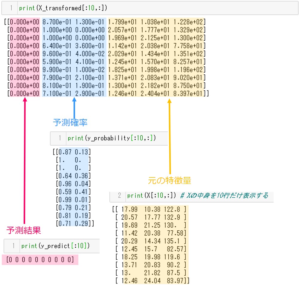 X_transformedの左から1列目は予測結果が格納されています。2列目~3列目は予測確率です。4列目以降に元の特徴量が格納されています。それぞれ値が一致することを確認してみてください。