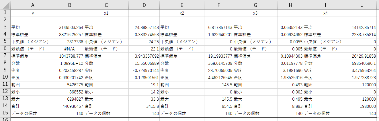 Excel 分析ツールの「基本統計量」では、以下の指標が出力されます。