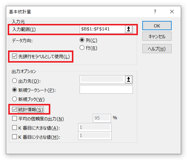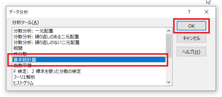 その中から「基本統計量」を探し選択し、【OK】ボタンを押します。