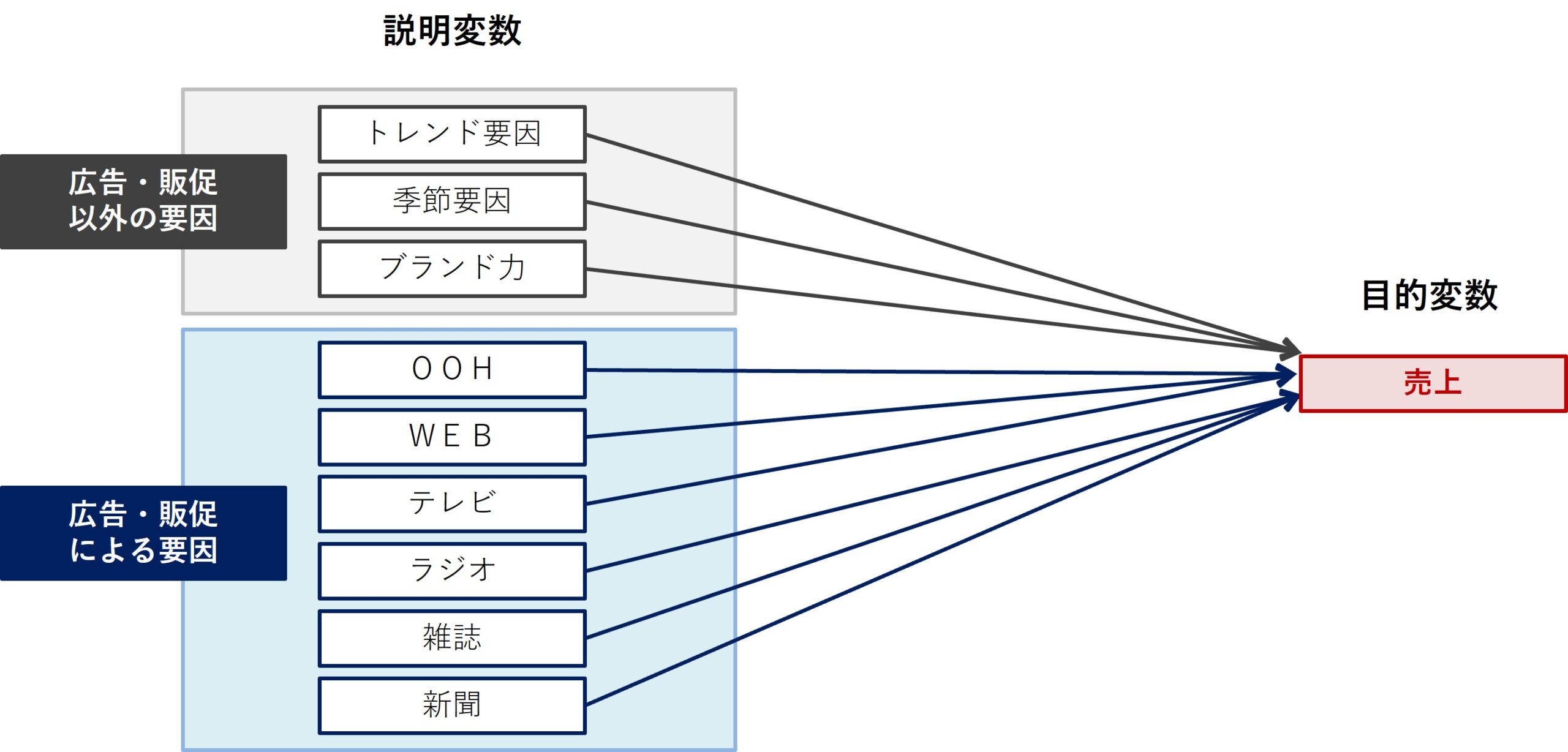 このモデルは、さまざまなマーケティング要素(広告、プロモーション、価格戦略など)が売上、ブランド認知度、顧客獲得などのビジネス成果にどのように影響を与えるかを定量的に評価します。