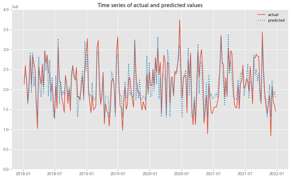 tscv = TimeSeriesSplit(n_splits=5): 5つのスプリットで時系列クロスバリデーションを設定します。- クロスバリデーションの各スプリットで、モデルを訓練セットで学習させ、テストセットで予測を行います。
