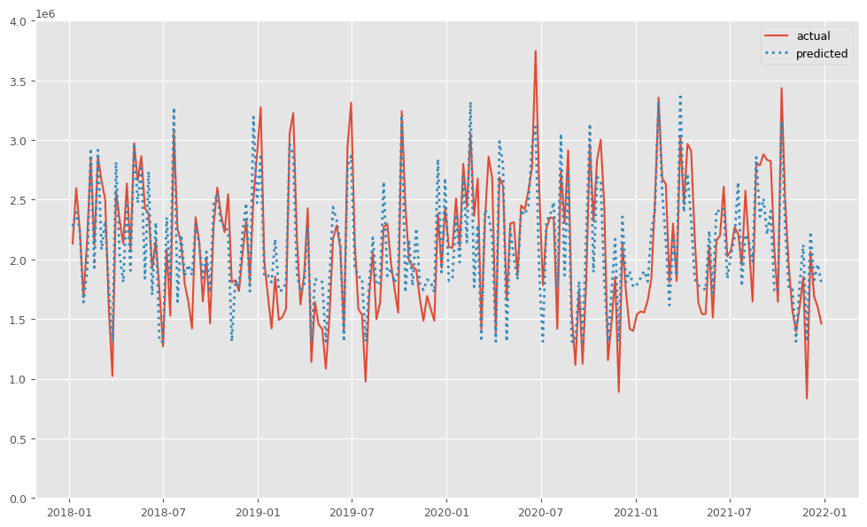 RMSE: 284667.75543375366 MAE: 237679.03680369648 MAPE: 0.12129533117154913 R2: 0.7400400171566186