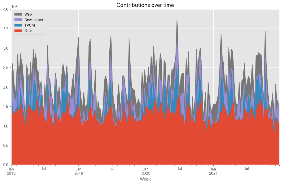 PythonによるMMM(マーケティングミックスモデリング)とビジネス活用- 振返り分析・線形回帰系モデル編(その2)-シンプルなアドストック付き線形回帰系MMM