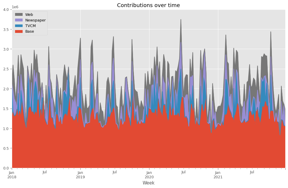 Base TVCM Newspaper Web Week 2018-01-07 1.228202e+06 903797.818512 0.000000 0.000000 2018-01-14 1.421614e+06 0.000000 531660.030809 642826.237425 2018-01-21 1.312771e+06 0.000000 421836.353350 501592.656643 2018-01-28 1.342945e+06 0.000000 337955.293144 0.000000 2018-02-04 1.490899e+06 0.000000 0.000000 664500.695306 ... ... ... ... ... 2021-11-28 8.339000e+05 0.000000 0.000000 0.000000 2021-12-05 1.213136e+06 0.000000 466142.340591 385422.124232 2021-12-12 1.212401e+06 0.000000 0.000000 477098.500907 2021-12-19 1.070570e+06 0.000000 529030.424495 0.000000 2021-12-26 1.061558e+06 0.000000 0.000000 399541.664899 [208 rows x 4 columns]