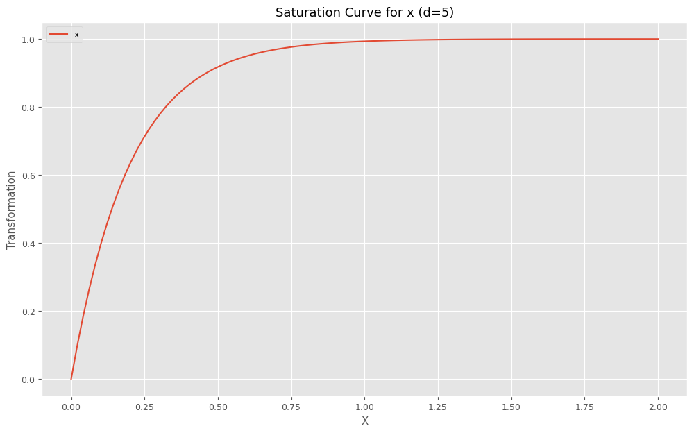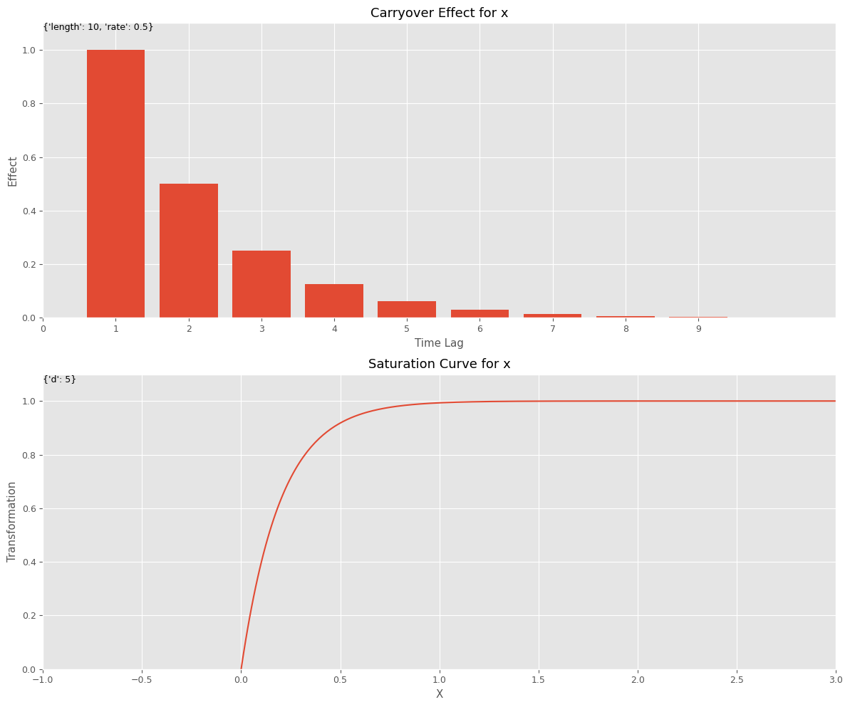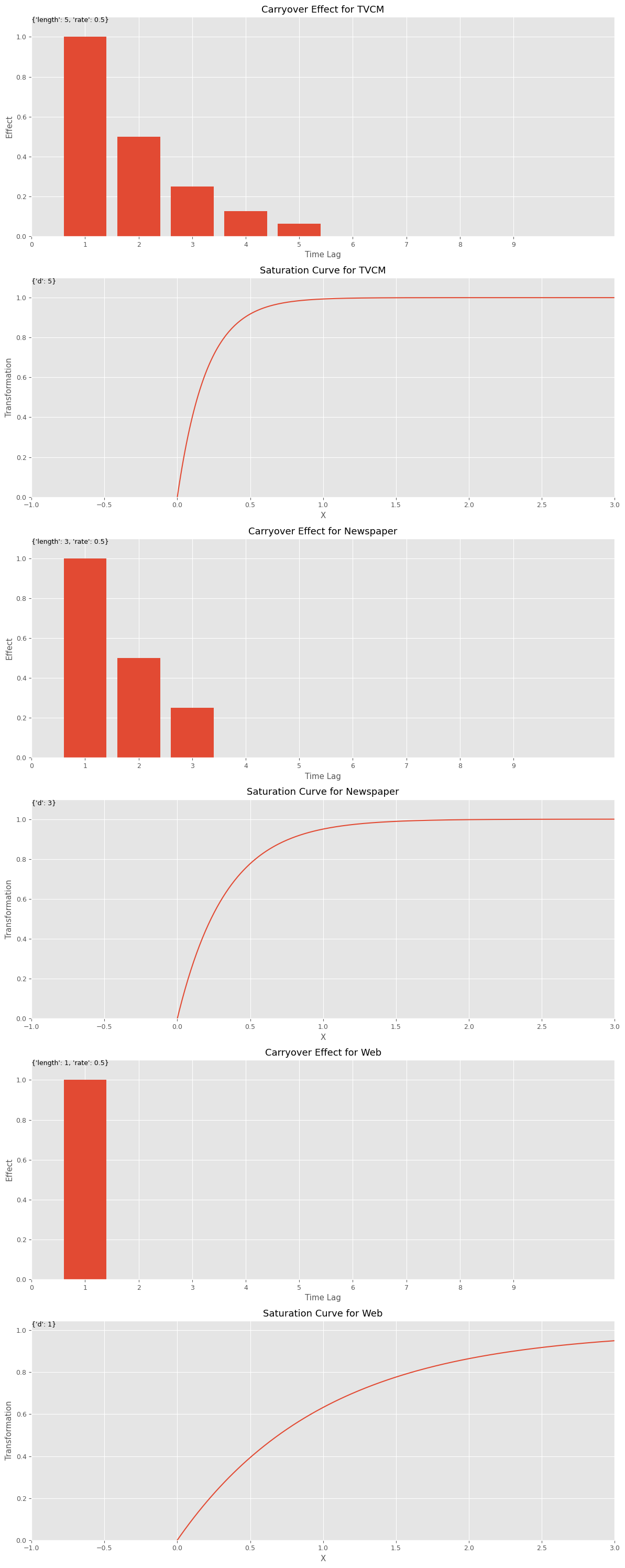 キャリーオーバー効果関数のハイパーパラメータのリストであるbest_carryover_paramsと、飽和関数のハイパーパラメータのリストであるbest_curve_paramsから、どのようなアドストック(キャリーオーバー効果関数と飽和関数)になったのかをグラフで確認してみます。