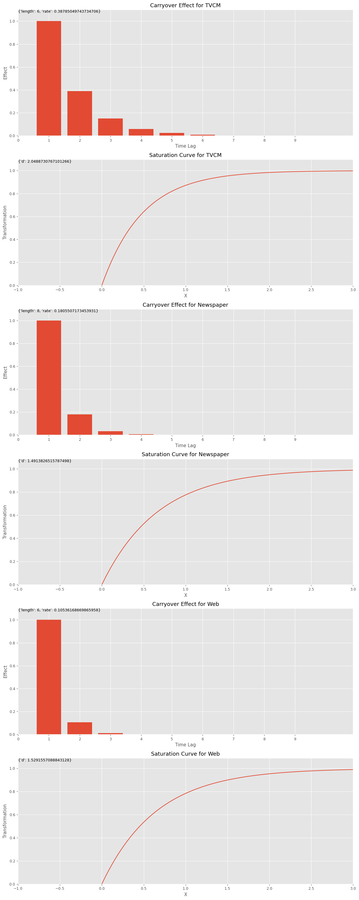 # グラフで確認 plot_effects(best_carryover_params, best_curve_params, X.columns)