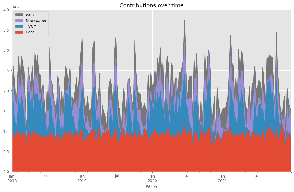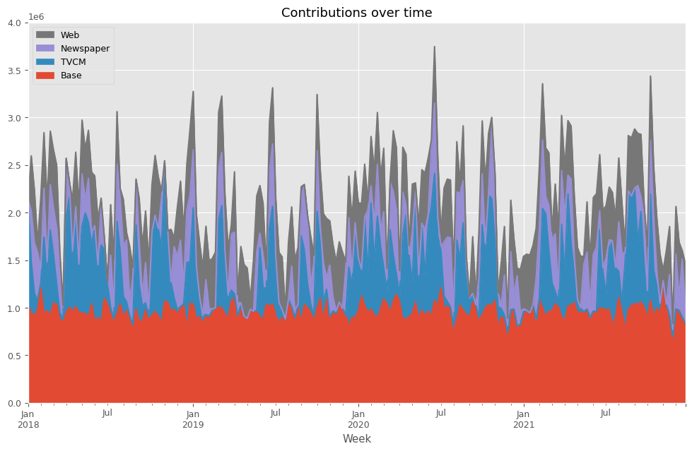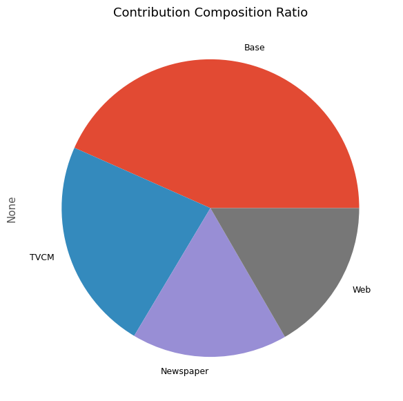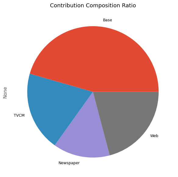 contribution ratio Base 1.919811e+08 0.437757 TVCM 9.511540e+07 0.216883 Newspaper 6.023040e+07 0.137338 Web 9.122923e+07 0.208022