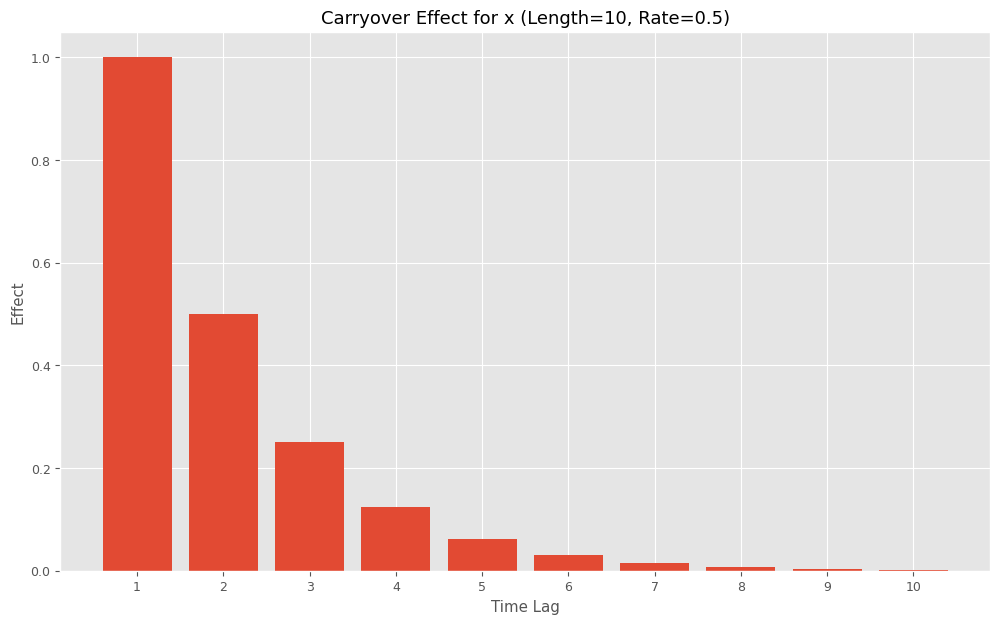 carryover_simplifiedという名前の関数は、三つの引数を取ります:X:入力データの配列。length:キャリオーバー効果を計算するための期間の長さ。rate:キャリオーバーの減衰率。