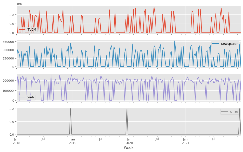 説明変数X(各メディアのコスト)をまとめてプロットします。